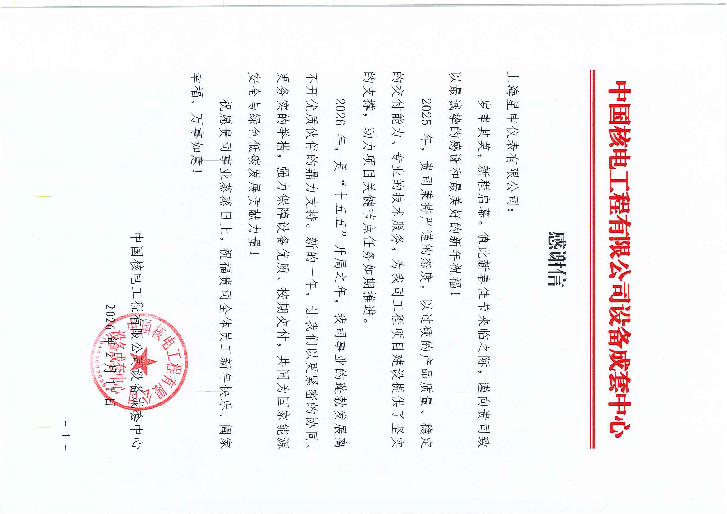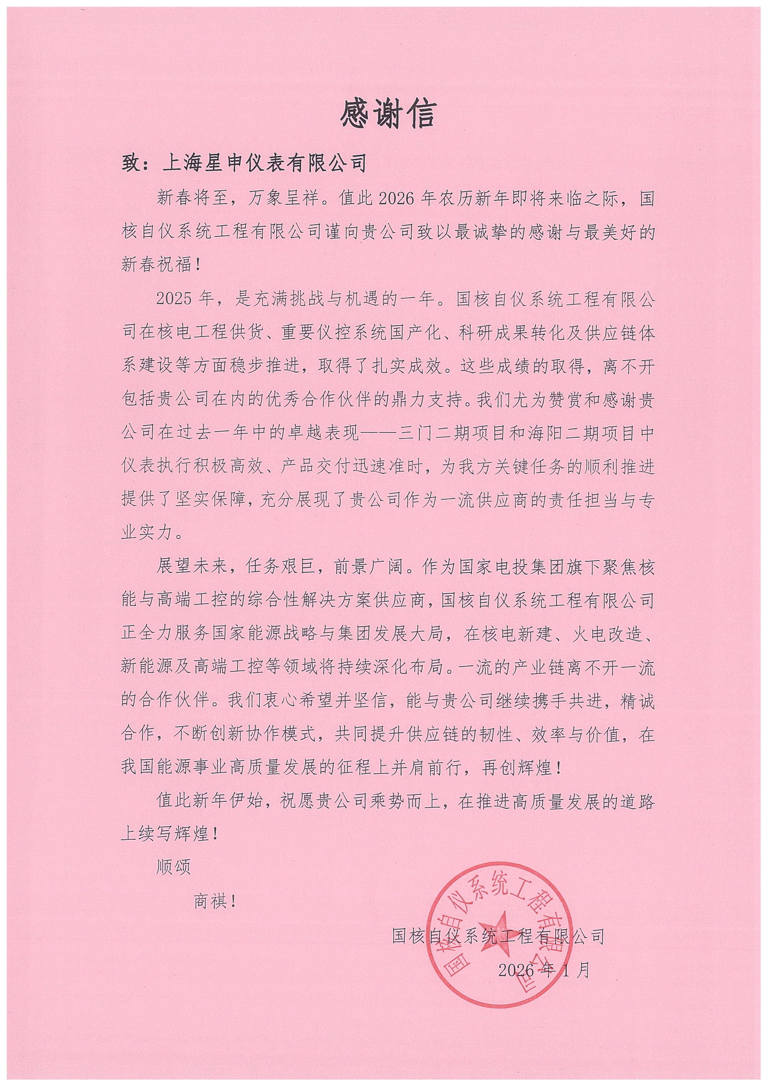 近日,上海星申仪表有限公司接连收到中国核电工程有限公司设备成套中心与国核自仪系统工程有限公司发来的感谢信,信中高度赞扬了公司在过去一年为核电项目所做出的突出贡献,彰显了公司在仪表生产领域的强大实力与专业水准。